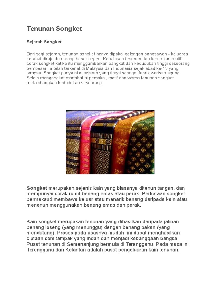 Tenunan songket mula berkembang dibeberepa negeri. Bahan dasar kain tenun songket adalah benang tenun yang disebut benang lusi atau lungsin. Kain Songket Kain songket adalah hasil tenunan tradisional masyarakat Melayu yang sangat bernilai.