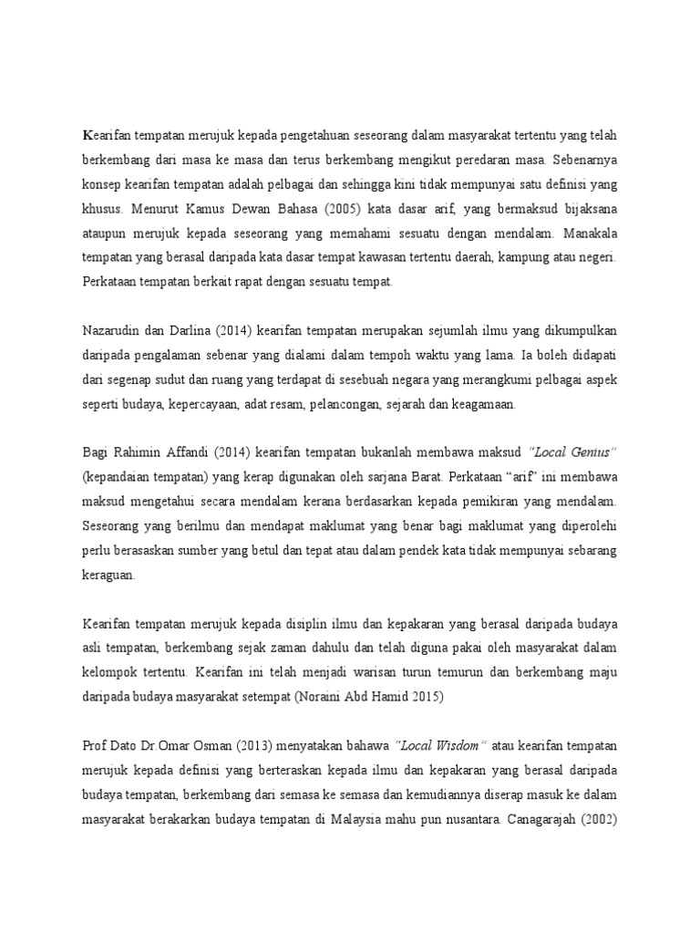 Dengan syarat bahawa a tiada seorang pun boleh dilarang atau dihalang daripada menggunakan selain bagi maksud rasmi atau daripada mengajarkan atau belajar apa- apa bahasa lain. 2 asas formula kearifan tempatan Melayu dan 3 pembuktian kitab jawi sebagai kearifan tempatan Melayu yang boleh dibanggakan. ABSTRAK Perbincangan berkaitan kearifan tempatan local wisdom telah lama beredar dalam kalangan akademia.