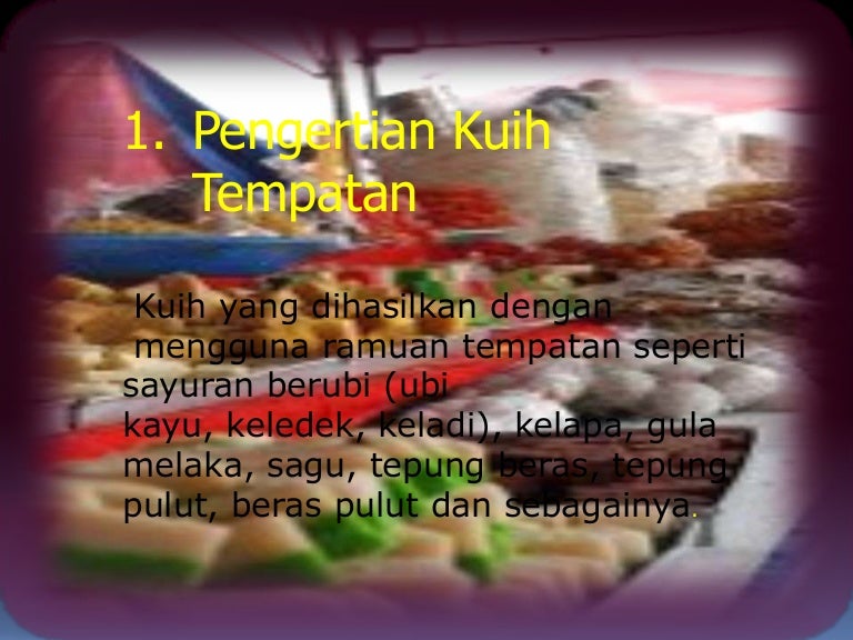 Sarapan pagi responden luar bandar bagi jenis kuih tempatan dalam tempoh seminggu 57 413 Taburan kekerapan dan peratus amalan pengambilan sarapan pagi responden luar bandar bagi jenis minuman dalam tempoh seminggu 59 414 Ujian-t corak pengambilan sarapan pagi murid bandar dengan luar bandar 60. Kuih tempatan bab 3 ting 1 5965 views. PENGERTIAN KUIH TEMPATANbr Kuih tempatan ialah br Kuih yang diperbuat daripada bahan tempatan seperti gula melaka kelapa tepung beras.