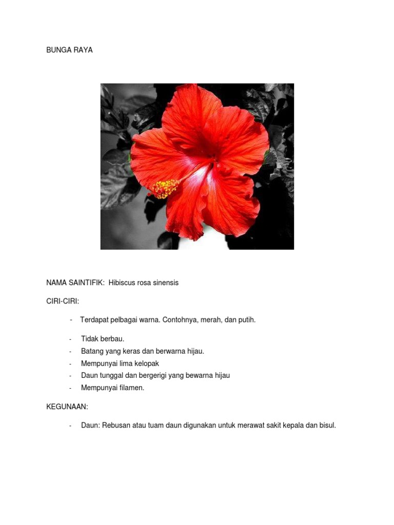 Selain daripada keindahan semulajadinya ia juga mempunyai sifat-sifat perawatan yang sangat penting. Bunga raya merupakan bunga kebangsaan kita. Bunga raya adalah bunga kebangsaan Malaysia.